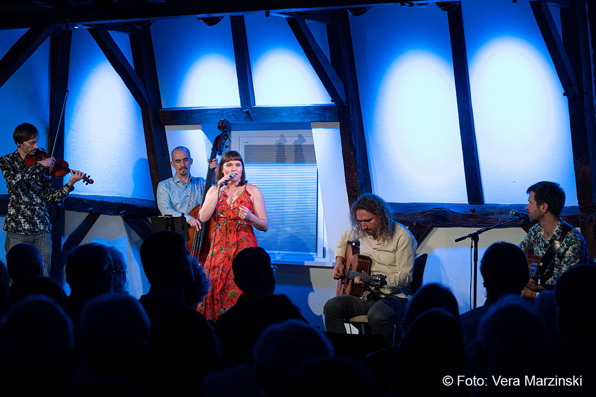 Die französische Sängerin Marion Lenfant-Preus und der polnische Gitarrist „Sobo“ Alexander Sobocinski gaben der Band den Namen. Dazu kommen noch mit Gitarre und Gesang Jonas Vogelsang, Frank Brempel mit seiner Violine und am Kontrabass David Andres. Sie haben einen ganz eigenen Mix aus Jazz und Chanson. Und sie kennen sich fast alle schon lange – angefangen hat es bei Jazz-Sessions in einer legendären Bonner Kneipe, die leider mittlerweile geschlossen ist. Doch die Band sei ein exklusiver Club aus dem man nicht mehr rauskomme, verriet Sobo. Und sie brauchen kein Schlagzeug, denn der Rhythmus kommt bei Ihnen vom Kontrabass und von den Gitarren.