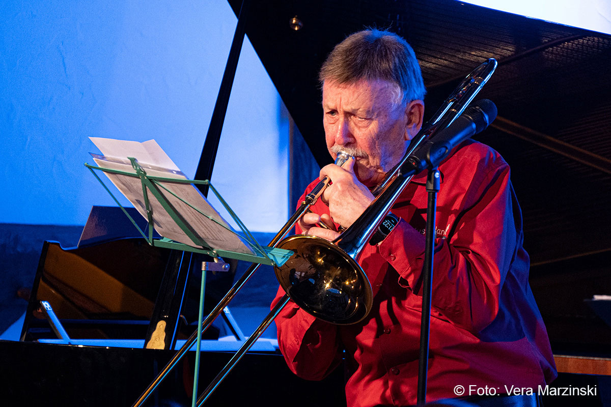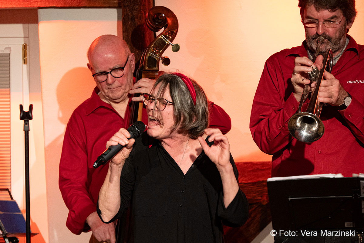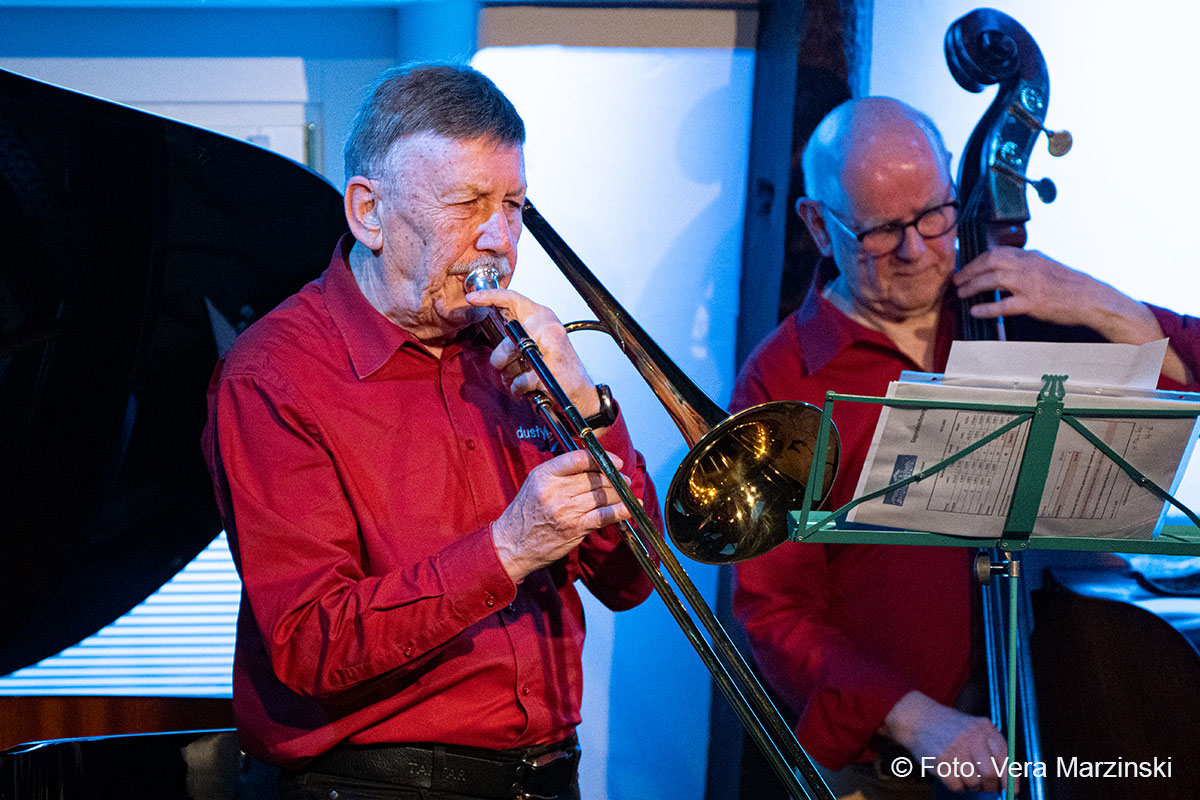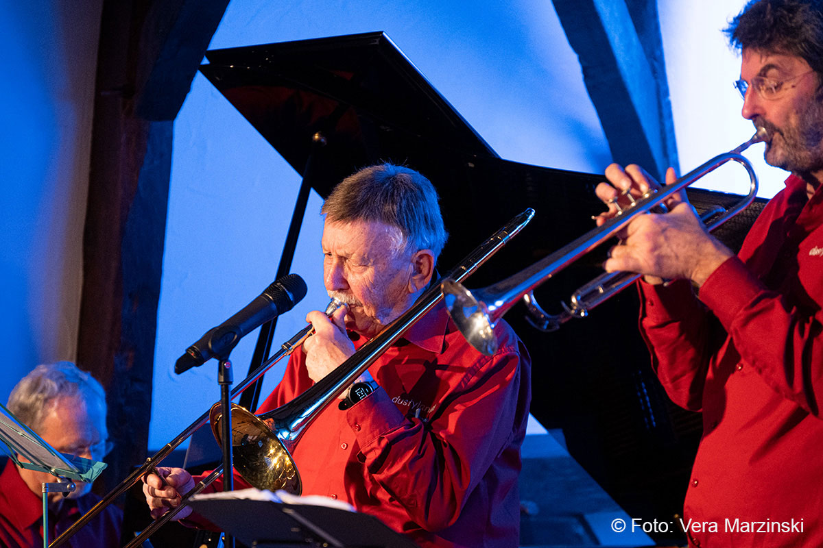 Die „Dusty Lane Jazzband“ ist eine der dienstältesten Jazzformationen im Ruhrgebiet – gegründet im April 1960 in Essen. In Wiehl nicht unbekannt, so spielten sie im September 2018 in der „Posthalterei“ in Wiehl. Allerdings sah die Besetzung da noch anders aus. Aber Pianist Peter Mischke, der seit 2012 am Tasteninstrument für die Band sitzt, war dabei und auch Jürgen Schlitt. Der spielt seit 1966 die Posaune bei den Dusty Lanes und hatte in Bielstein sein letztes Bühnenkonzert. Der 82-Jährige ließ brillant sein Instrument erklingen. Auch bei „What a wonderful world“, zudem er betonte, dass das Stück gespielt werden müsse, auch wenn es im Moment nicht so gut aussehe in der Welt – um ein bisschen Mut zu machen. Die Moderation oblag zum größten Teil Trompeter Gerd Debring, der seit 2023 in der Band aktiv ist und in Mülheim an der Ruhr lebt. Ebenfalls 2023 dazu gekommen ist Erich Leininger, der Saxophon und Klarinette spielt. Seit 2022 hat Barbara Schirdewahn-Debring den Haupt-Gesangspart inne und im gleichen Jahr kam Schlagzeuger Achim Bräuer dazu. Am Bass in Bielstein Nico Gastreich. Er war als Ersatzmann eingesprungen, aber er spielt ansonsten nicht nur den Kontrabass, sondern auch Tuba. Zudem war er 23 Jahre Mitglied der „Pilspicker Jazzband“ in Dortmund und gründete 1990 die „Joys of Jazz“.