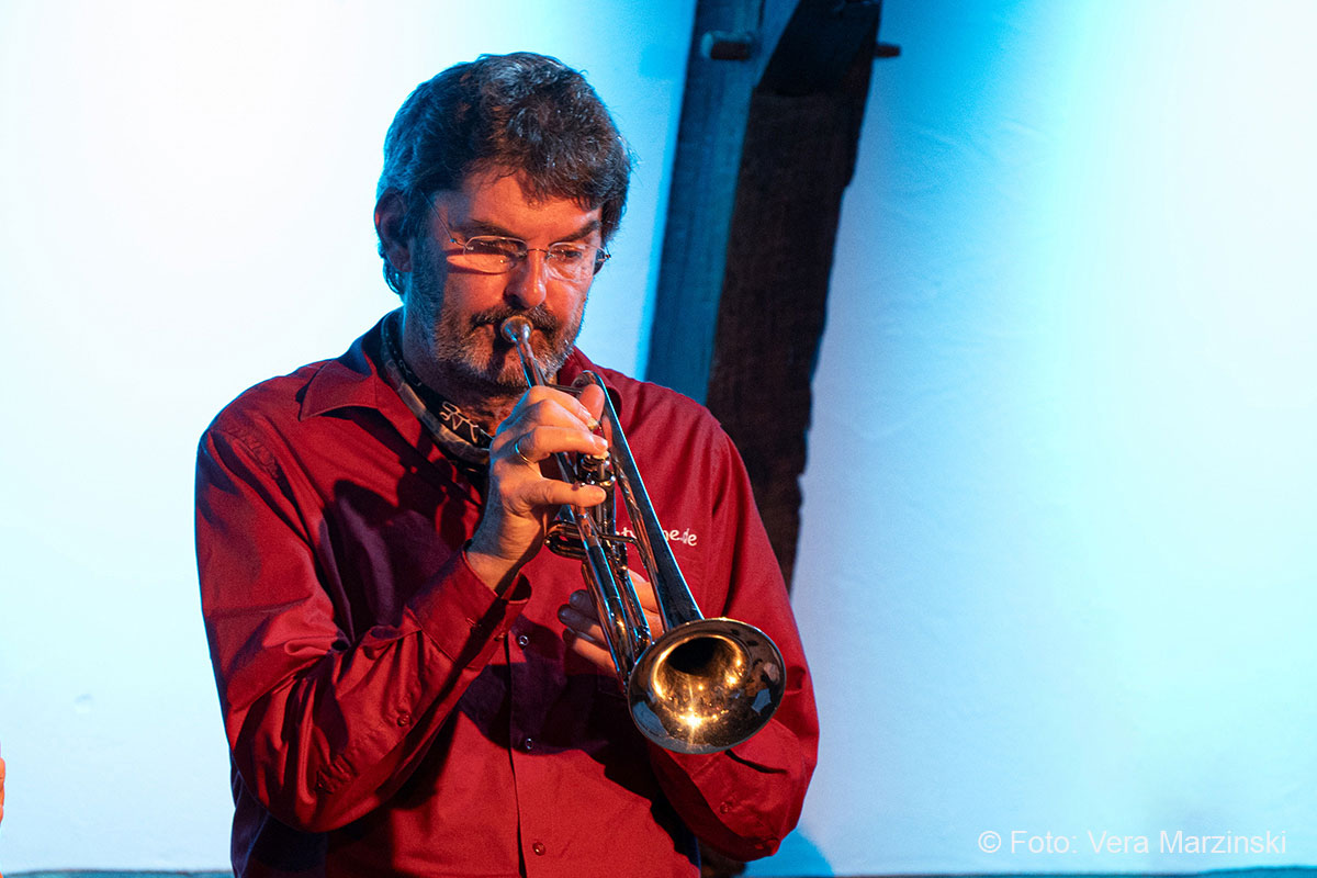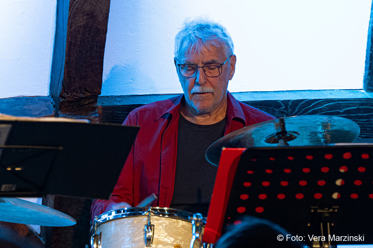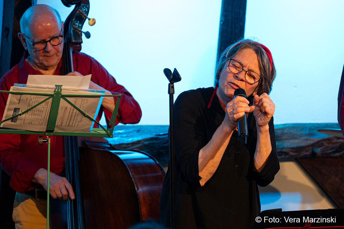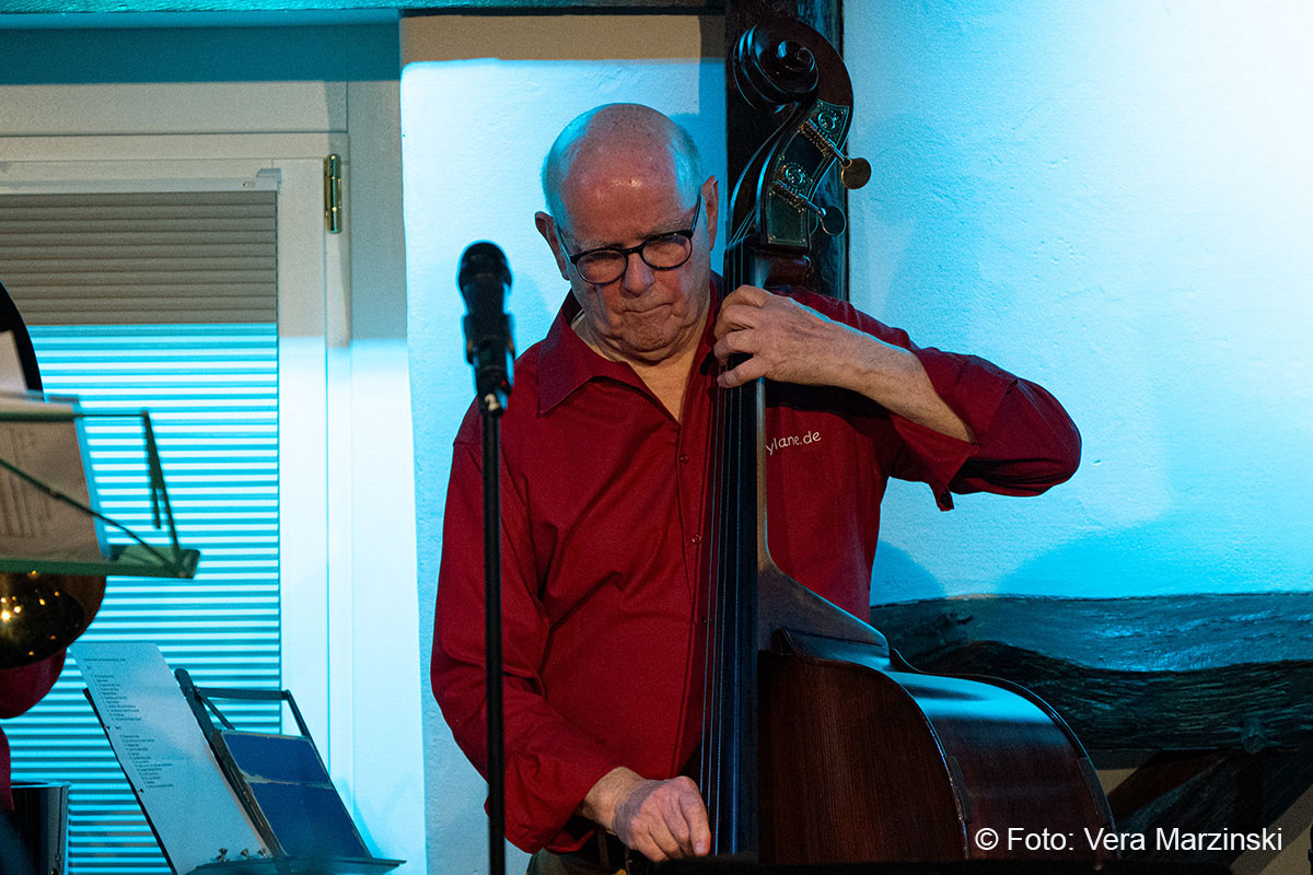 Die „Dusty Lane Jazzband“ ist eine der dienstältesten Jazzformationen im Ruhrgebiet – gegründet im April 1960 in Essen. In Wiehl nicht unbekannt, so spielten sie im September 2018 in der „Posthalterei“ in Wiehl. Allerdings sah die Besetzung da noch anders aus. Aber Pianist Peter Mischke, der seit 2012 am Tasteninstrument für die Band sitzt, war dabei und auch Jürgen Schlitt. Der spielt seit 1966 die Posaune bei den Dusty Lanes und hatte in Bielstein sein letztes Bühnenkonzert. Der 82-Jährige ließ brillant sein Instrument erklingen. Auch bei „What a wonderful world“, zudem er betonte, dass das Stück gespielt werden müsse, auch wenn es im Moment nicht so gut aussehe in der Welt – um ein bisschen Mut zu machen. Die Moderation oblag zum größten Teil Trompeter Gerd Debring, der seit 2023 in der Band aktiv ist und in Mülheim an der Ruhr lebt. Ebenfalls 2023 dazu gekommen ist Erich Leininger, der Saxophon und Klarinette spielt. Seit 2022 hat Barbara Schirdewahn-Debring den Haupt-Gesangspart inne und im gleichen Jahr kam Schlagzeuger Achim Bräuer dazu. Am Bass in Bielstein Nico Gastreich. Er war als Ersatzmann eingesprungen, aber er spielt ansonsten nicht nur den Kontrabass, sondern auch Tuba. Zudem war er 23 Jahre Mitglied der „Pilspicker Jazzband“ in Dortmund und gründete 1990 die „Joys of Jazz“.