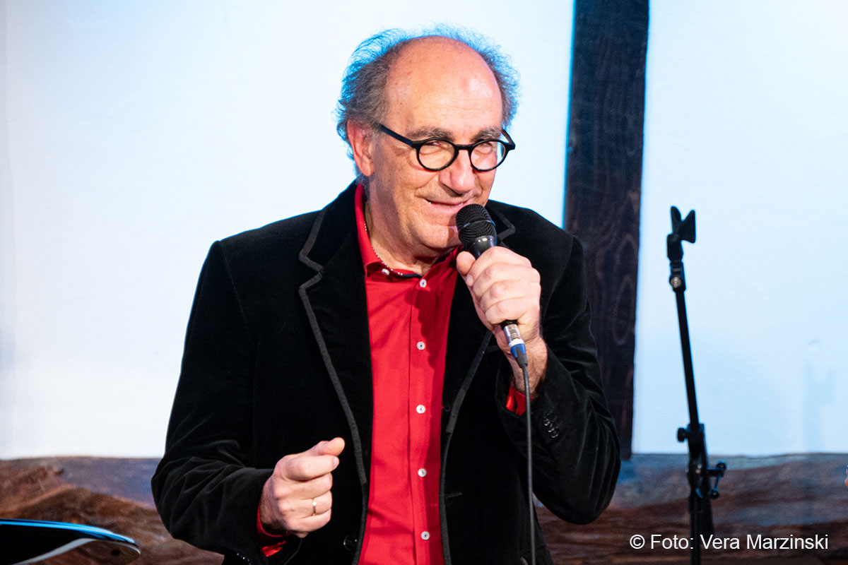 Das von Charles Aznavour stammende „Noel d’autrefois“ – Weihnachten einst – erinnere Jean-Claude an den Weihnachtsbaum, der bei seiner nun 93jährigen Mutter seit über 50 Jahren stehe. Ein künstlicher – wobei Jean-Claude meinte er sei aus Plastik, seine Frau wusste: er ist aus Aluminium. „First of may“ klinge erstmal nicht weihnachtlich, so Jean-Claude. Aber darin gehe es darum, dass der Weihnachtsbaum immer kleiner werde mit zunehmendem eigenen Alter. Das Stück ist im Original von den BeeGees. Maries Lieblingsweihnachtsstück stammt von Georg Kreisler – das „Weihnachten ist eine schöne Zeit“. Anschließend trabte musikalisch „Rudolph the red nosed reindeer“ mit Marie und Jean-Claude durchs Burghaus. Und solistisch und mit Loop-Station ein beeindruckendes „Der kleine Trommler“ von Marie Séférian. Ihre Loopstation heiße Elaine seit sie mit dem letzten Programm in Wiehl waren, verriet sie.