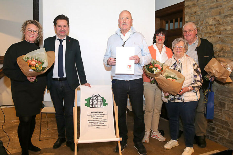 Für den Gründer und langjährigen Vorsitzenden des Freibad-Fördervereins kam die Anerkennung überraschend. Der Verein hatte zur Jahreshauptversammlung ins Burghaus Bielstein eingeladen. Unter anderem stand die komplette Neuwahl des Vorstands auf der Tagesordnung – nach teils 15 Jahren Tätigkeit seit Vereinsgründung traten die bisherigen Mitglieder nicht mehr an.