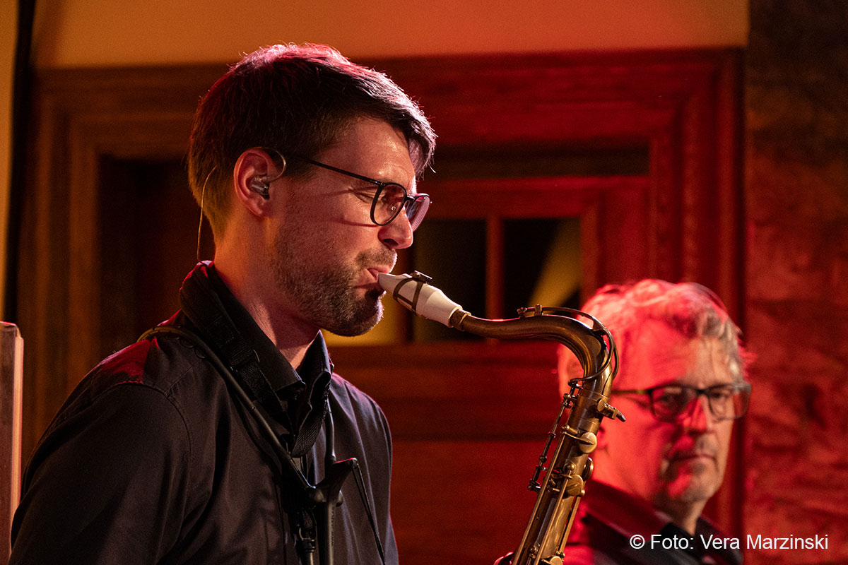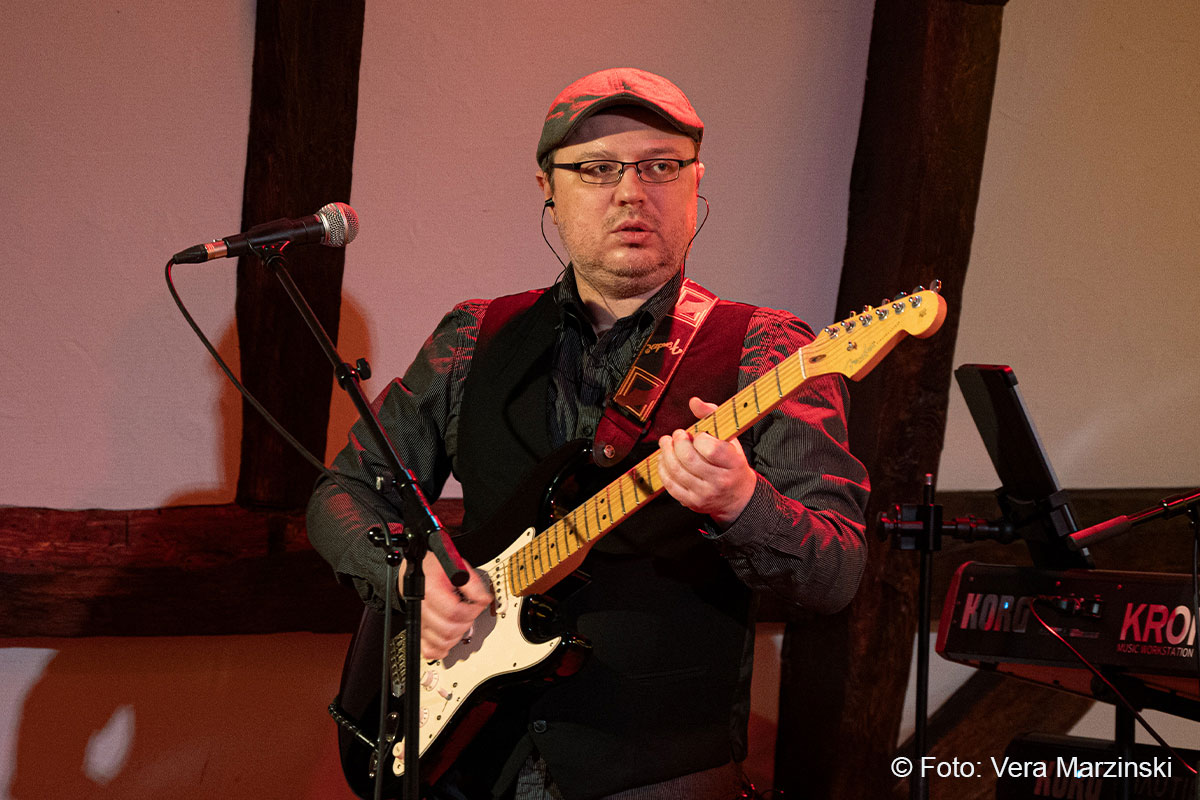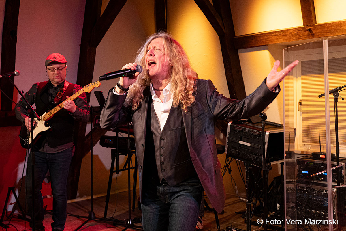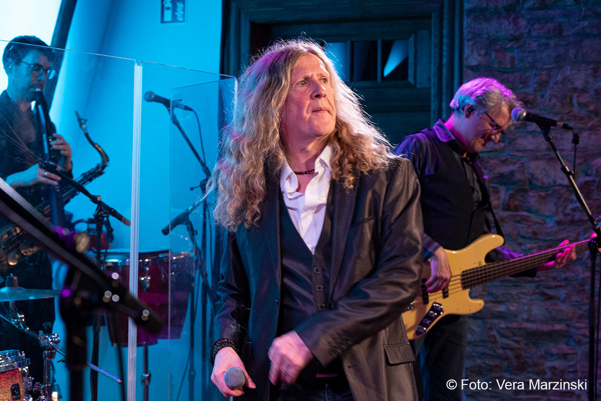 „Wollt ihr gerne singen?“ und „“ich hoffe ihr singt laut!“ kam von Manni Lohuis, bevor sie „Stars“ spielten. Das falsche Lied zur falschen Tageszeit sei das darauffolgende zwar, aber bis zum nächsten Morgen wollten sie nun doch nicht bleiben um „Sunrise“ vorzutragen. Sänger Manni wollte außerdem wissen, ob das hier eine Reggae-Gegend sei und animierte zum Mitsingen beim „Night Nurse“, Das stammt im Original vom Jamaikaner Gregory Isaacs – Simply Red veröffentlichte es 1997. Und das Mitsingen klappte erstaunlich gut in Bielstein. Ein Aufstöhnen ging durch den Burghaus-Saal bei den ersten Tönen von „If you don‘t know me by now“. Das hat die Band selbst lautstark in der Lancess Arena in Köln beim letzten Simply Red Konzert mitgesungen erzählte Sänger Manfred Lohuis. Wie schon bei anderen Stücken zuvor bot Bernhard Graweloh ein brillantes Saxophonsolo. Das war zum relaxed Dahinschweben – beim anschließenden „Fairground“ gab nicht nur die Band richtig Gas. Von Cole Porter coverte Simply Red „Ev’ry time we say goodbye“ – in Bielstein gab es dieses Stück von „The Right Thing“ in kleiner Besetzung. Nur Hammond, Saxophon und Gesang. Als Alex Rosenhof die Holzgitarre rausholte, folgte das Lieblingslied des Sängers: „For your babies“. Insgesamt ein schöner Wechsel von Balladen-Stücken zu sehr tanzbaren wie „Money‘s to tight to mention“ aus 1985. Und so ließen sich die Burghausgäste von den mitreißenden Klängen von „Simply Red“ verzaubern und erlebten mit „The Right Thing“ einen Abend voller musikalischer Höhepunkte. Mit „die hier sind richtig gut“, hatte Hans-Joachim Klein genau richtig gelegen und nach drei Tribute-Abenden konnte man sagen: „Aller guten Bands/Dinge sind drei“.