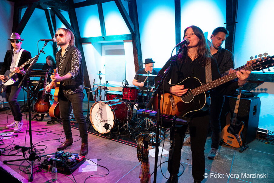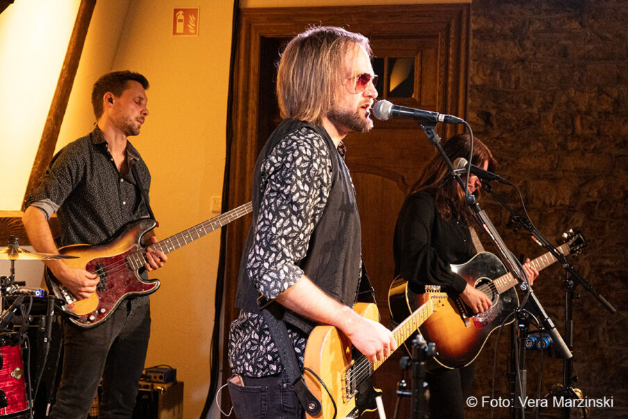 Gute Laune verbreiteten sie auf alle Fälle – nicht nur mit „You got lucky“. Mit dabei auch das „Free fallin‘ “, der sicherlich mit Abstand der beliebteste Song von Tom Petty. Seine Songs beschreiben das Gefühl von Freiheit, Lockerheit und Sorglosigkeit. Dieses Gefühl erlebten Toby und Andy von der Band ECHO, als sie 2011 in Kalifornien mit dem Mietwagen unterwegs waren. In den Radiostationen waren Songs wie „Free Fallin“, „Running down a dream“ oder „I won`t back down“ täglich zu hören und sorgten für den perfekten Soundtrack. Da entstand schon der Gedanke „Irgendwann gründen wir eine Tributeband!“. Nach dem überraschenden Tod von Tom Petty im Oktober 2017 wurde der Gedanke konkret und die beiden Gitarristen gründeten mit Daria und Isa (Gesang), Luke (Schlagzeug), Chris (Bass) und Andrew (Keyboard) die Tribute-Band „ECHO“. Das Gefühl, Tom Petty nochmal live zu erleben, wird von ihnen absolut authentisch übermittelt und bis ins kleinste Detail zelebriert, was auch die Gäste im Burghaus Bielstein erleben konnten.
