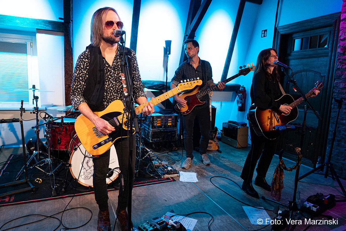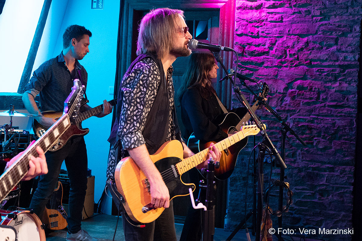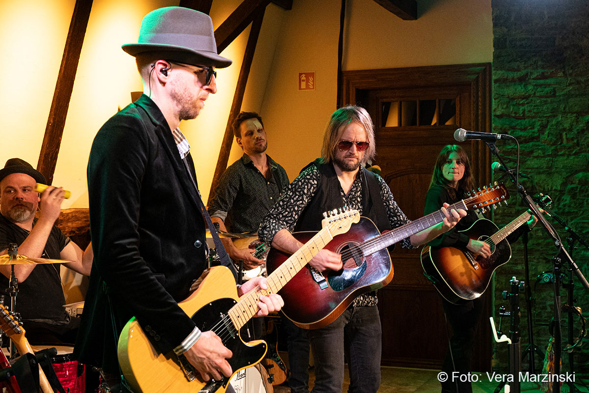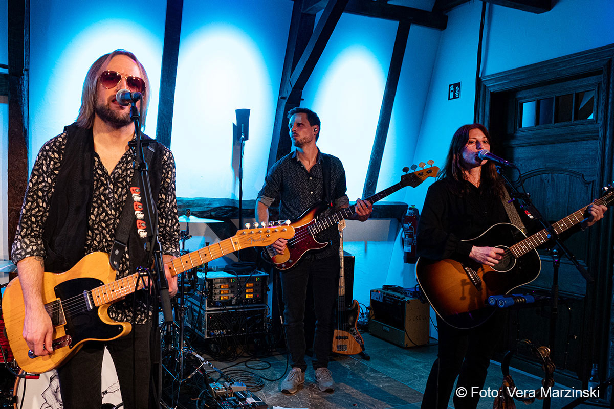 Gute Laune verbreiteten sie auf alle Fälle – nicht nur mit „You got lucky“. Mit dabei auch das „Free fallin‘ “, der sicherlich mit Abstand der beliebteste Song von Tom Petty. Seine Songs beschreiben das Gefühl von Freiheit, Lockerheit und Sorglosigkeit. Dieses Gefühl erlebten Toby und Andy von der Band ECHO, als sie 2011 in Kalifornien mit dem Mietwagen unterwegs waren. In den Radiostationen waren Songs wie „Free Fallin“, „Running down a dream“ oder „I won`t back down“ täglich zu hören und sorgten für den perfekten Soundtrack. Da entstand schon der Gedanke „Irgendwann gründen wir eine Tributeband!“. Nach dem überraschenden Tod von Tom Petty im Oktober 2017 wurde der Gedanke konkret und die beiden Gitarristen gründeten mit Daria und Isa (Gesang), Luke (Schlagzeug), Chris (Bass) und Andrew (Keyboard) die Tribute-Band „ECHO“. Das Gefühl, Tom Petty nochmal live zu erleben, wird von ihnen absolut authentisch übermittelt und bis ins kleinste Detail zelebriert, was auch die Gäste im Burghaus Bielstein erleben konnten.