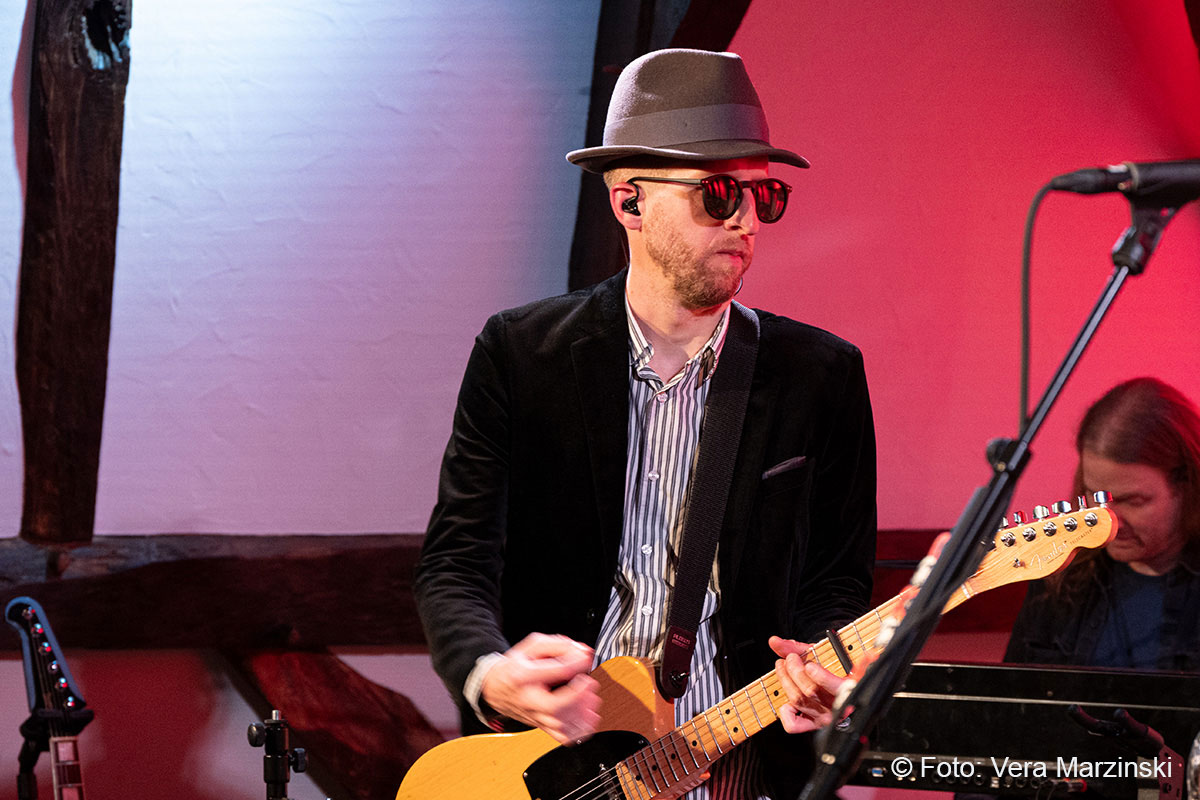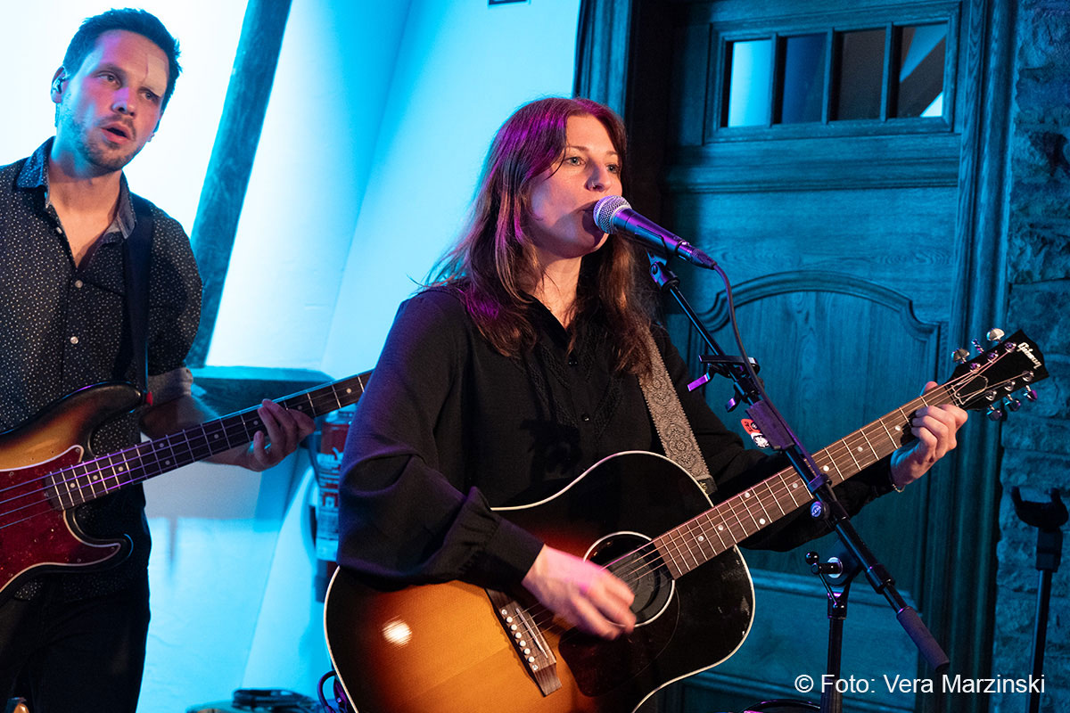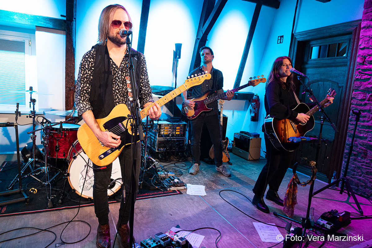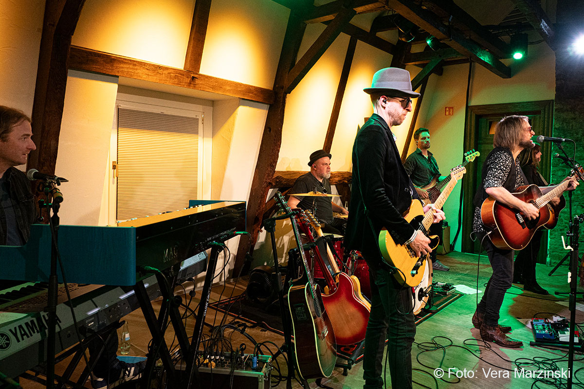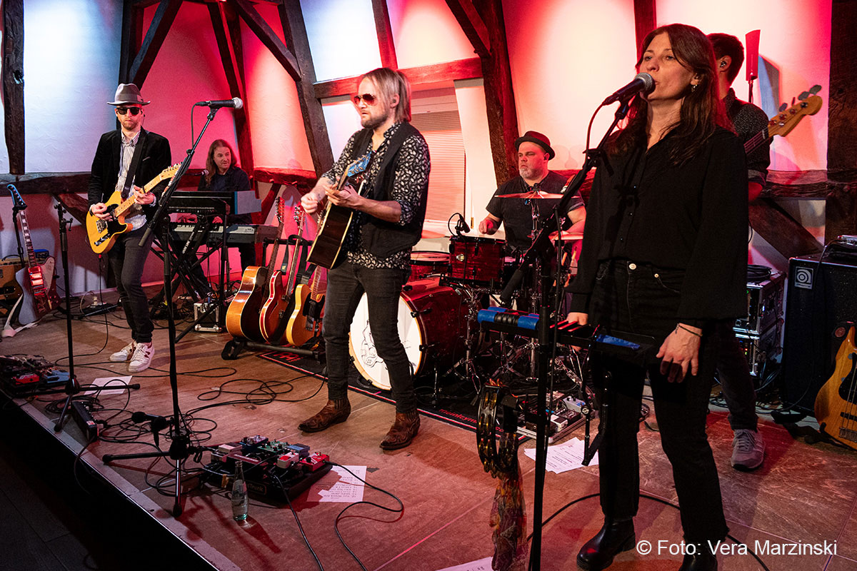 Gute Laune verbreiteten sie auf alle Fälle – nicht nur mit „You got lucky“. Mit dabei auch das „Free fallin‘ “, der sicherlich mit Abstand der beliebteste Song von Tom Petty. Seine Songs beschreiben das Gefühl von Freiheit, Lockerheit und Sorglosigkeit. Dieses Gefühl erlebten Toby und Andy von der Band ECHO, als sie 2011 in Kalifornien mit dem Mietwagen unterwegs waren. In den Radiostationen waren Songs wie „Free Fallin“, „Running down a dream“ oder „I won`t back down“ täglich zu hören und sorgten für den perfekten Soundtrack. Da entstand schon der Gedanke „Irgendwann gründen wir eine Tributeband!“. Nach dem überraschenden Tod von Tom Petty im Oktober 2017 wurde der Gedanke konkret und die beiden Gitarristen gründeten mit Daria und Isa (Gesang), Luke (Schlagzeug), Chris (Bass) und Andrew (Keyboard) die Tribute-Band „ECHO“. Das Gefühl, Tom Petty nochmal live zu erleben, wird von ihnen absolut authentisch übermittelt und bis ins kleinste Detail zelebriert, was auch die Gäste im Burghaus Bielstein erleben konnten.