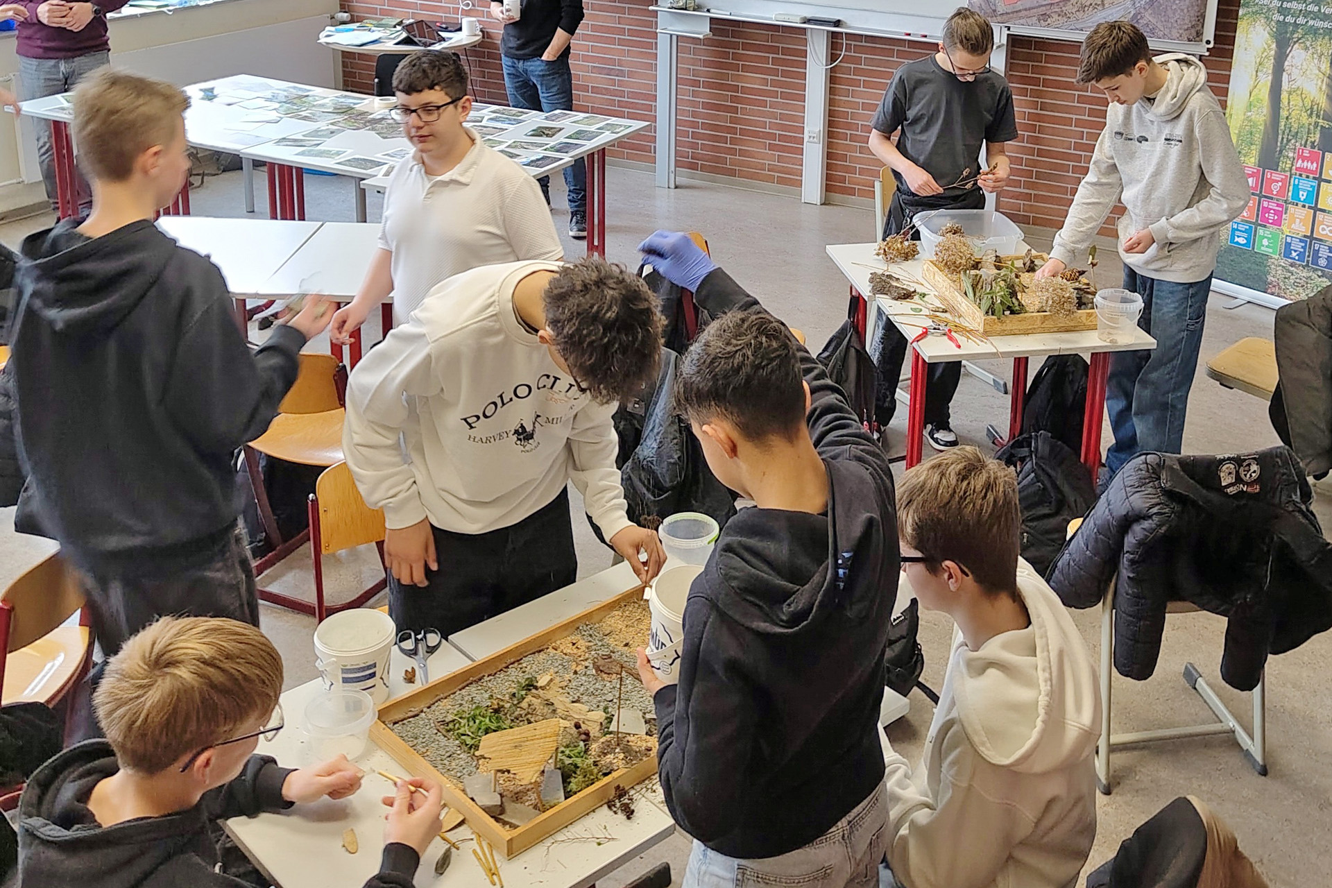 Wie sollte der Schulhof an der TOB in Zukunft vor dem Hintergrund des Klimawandels aussehen? Mit dieser Frage befassten sich kürzlich Schülerinnen und Schüler des MINT-Kurses der Schule – wobei die vier Buchstaben für Mathematik, Informatik, Naturwissenschaften und Technik stehen. Im Rahmen des Workshops waren sie aufgerufen, „mit den Händen zu denken“. Konkret konnten die Jugendlichen in Kleingruppen Fantasiemodelle des Schulhofs entwerfen. Zur Gestaltung standen ihnen verschiedene Naturmaterialien zur Verfügung wie Steine, Sand und Moose.